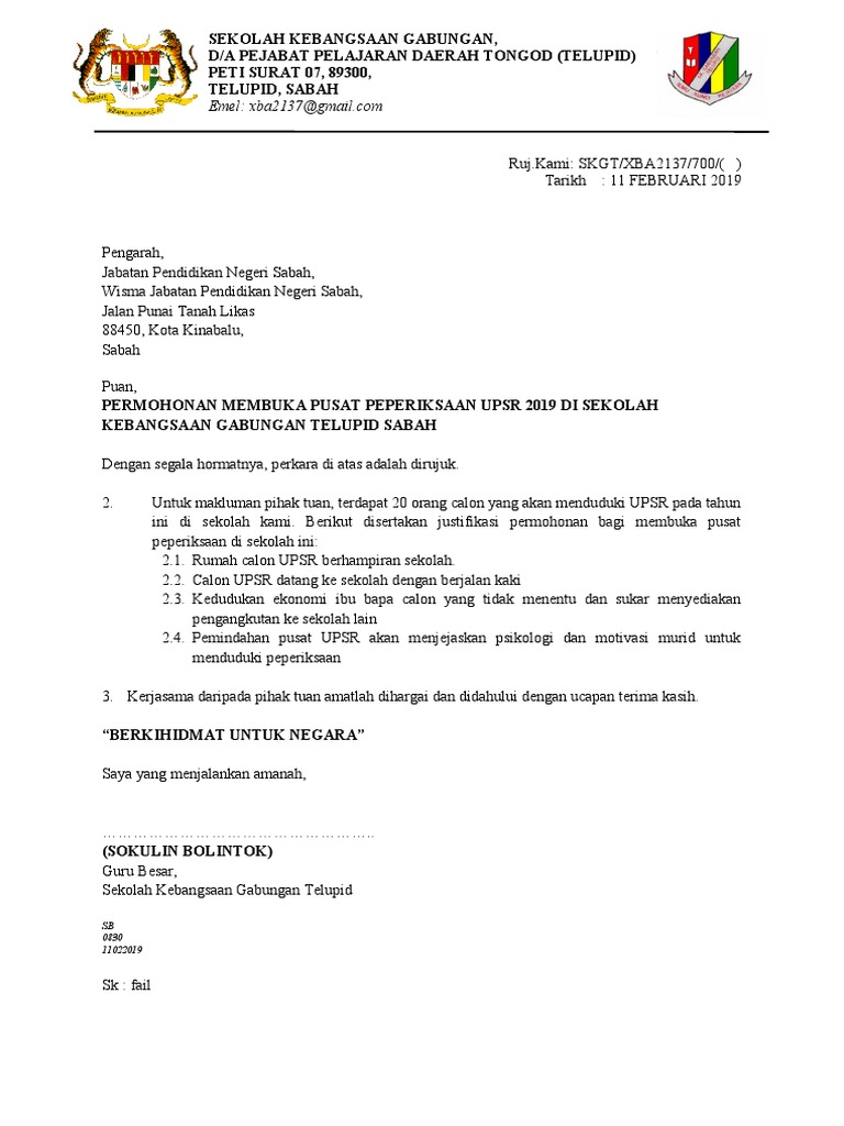 Surat Permohonan Buka Pusat Upsr 2019 Sk Gabungan Telupid Pdf